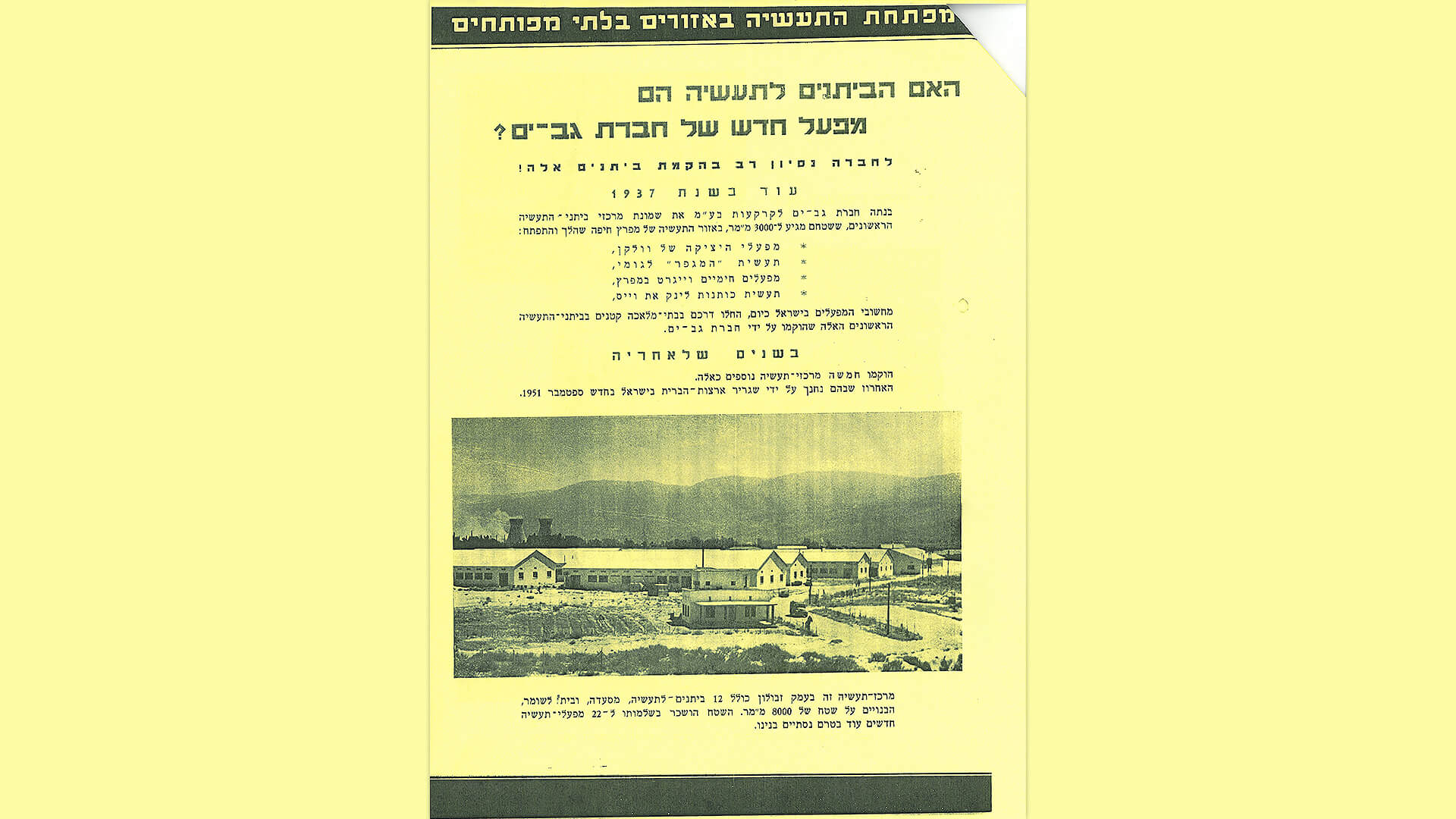 בשנת 1951 הוקמה חברת גב-ים למחסני ערובה בע"מ, חברה שהתמקדה בהקמת מחסנים ופתרונות לוגיסטיים עבור תעשיות שונות. החברה פעלה למתן שירותי אחסון ומחסנים בטוחים עבור סחורות, כשהיא תורמת לפיתוח התשתיות הכלכליות והלוגיסטיות של ישראל בשנותיה הראשונות. גב-ים הפכה לגורם משמעותי בתמיכה בהתפתחות הכלכלה הישראלית ובקידום תחום המחסנים וההפצה.