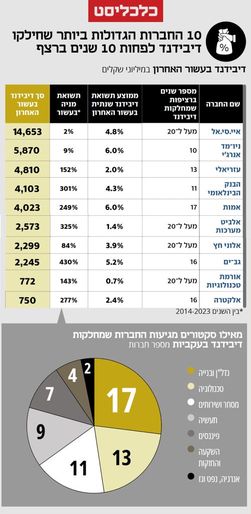The results of the examination show that of the 63 companies in question, 19 distributed dividend for at least 20 years, including Elbit Systems that is controlled by Mikey Federmann, which in the last decade distributed ILS 2.6 billion as dividends, and Ormat Technologies, which distributed ILS 772 million in a decade. It also includes ICL (formerly Israeli Chemicals) controlled by Idan Ofer, with a dividends policy of up to 50% of its profits, which in a decade distributed over ILS 14 billion in dividends.